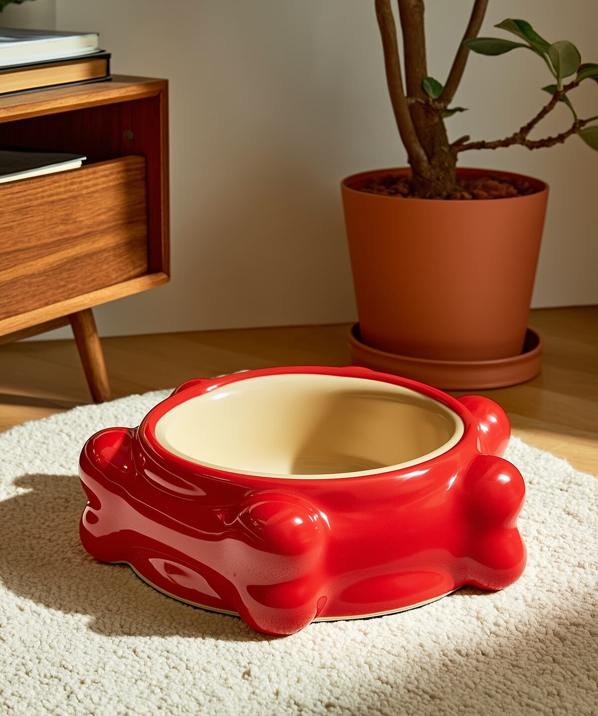 The Red Ceramic Bone Dog Bowl is a bold and functional feeding accessory for your pup. Made from high-quality ceramic, it features raised bone-shaped accents around the edge and a glossy, easy-to-clean surface inside. Its sturdy weight helps prevent tipping, while its eye-catching red finish adds a cheerful touch to any feeding station.